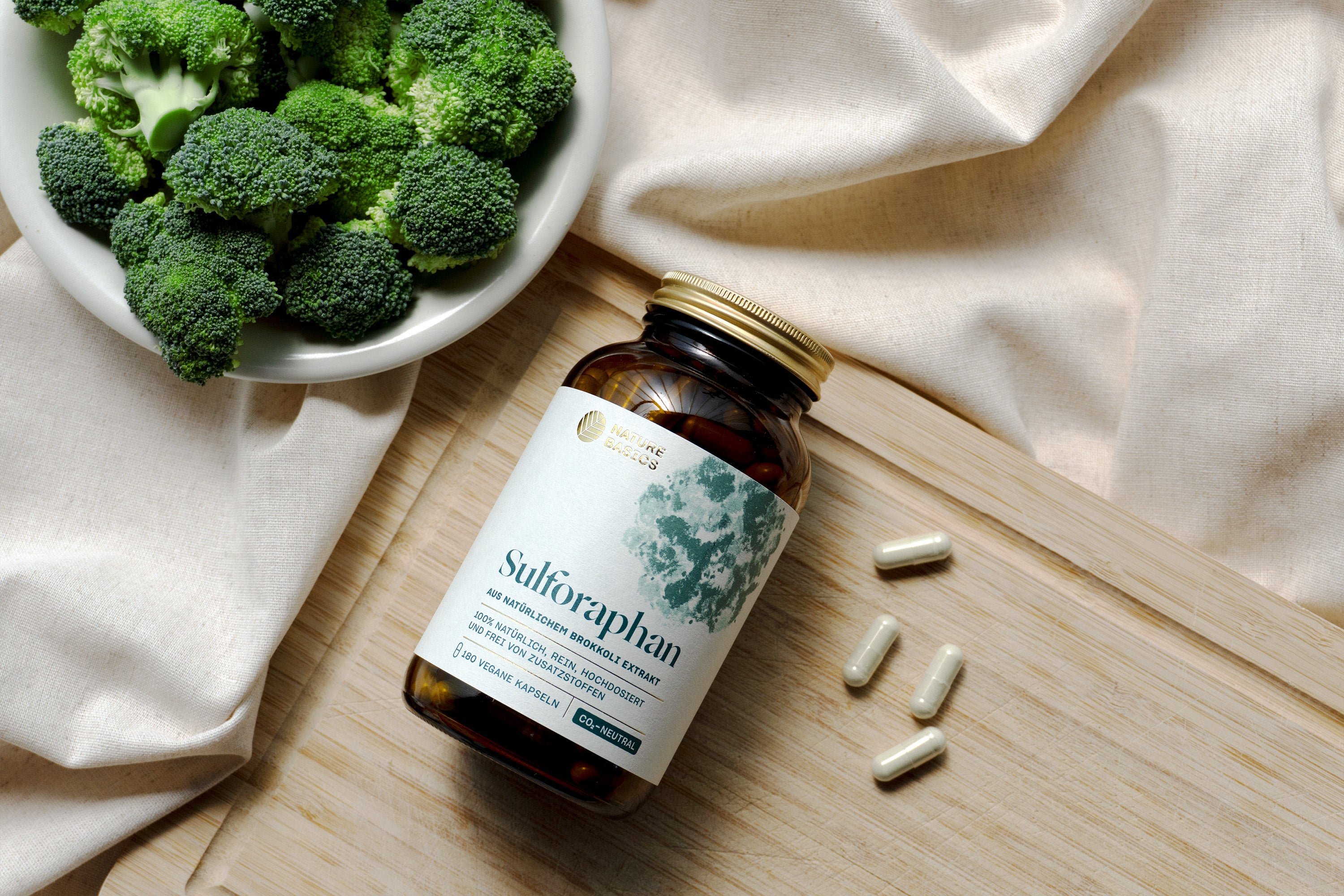Wir verwenden gut verträgliches und natürliches Sulforaphan aus Brokkoli Extrakt von Brokkolisprossen. Auf unerwünschte Zusatzstoffe verzichten wir gänzlich.